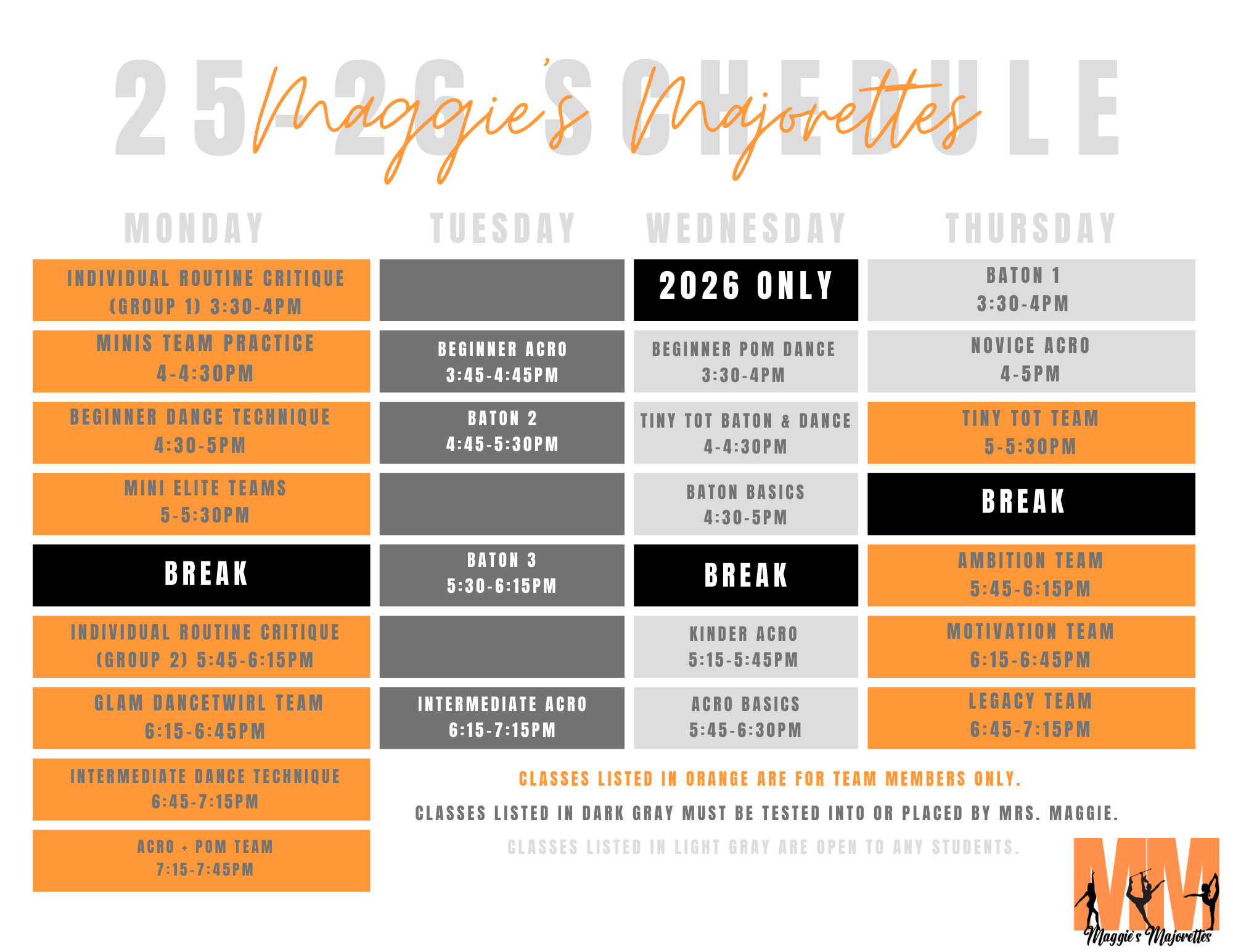 Classes run with Maggie’s Majorettes run September - May, ending with an End of the Year Showcase program. We would love to have your child in class with us.